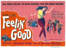 FEELIN' GOOD (1966) Travis had reconstructive surgery on his ankle, and wrote songs for the Five Beats while at Chelsea Naval Hospital, anticipating a return to Germany. Buoyed by the success of Demo Derby that played on screens across the US with the Beatles Hard Day�s Night, and the praise of New York tunesmiths� for Travis� songs, Jim Pike decided to make his rock musical comedy, Feelin� Good, with Travis performing 8 of his songs recorded with the Brattle Street East. Click image (left), to view TOPIC. |