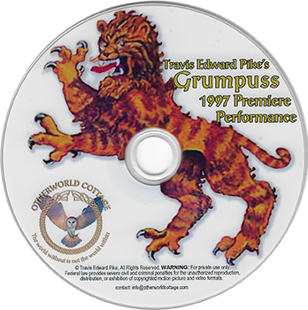 Travis owned the rights to the 1997 PAL digibeta recording of his live world premiere benefit performance of Grumpuss for the Save the Children Fund, staged at the World Heritage Site Blenheim Palace, home of the Duke of Marlborough, and birthplace of Sir Winston Churchill. He brought his edited PAL Digibeta cassette to Deluxe in Burbank, California to have it converted for DVD, and it looked fantastic! Travis met Brent Backhus through New Playwrights Foundation readings where they chatted during the breaks. Brent was also a multi-talent, involved in both film and music, a skilled digital video editor (Final Cut Pro), and authored DVD productions. Travis invited Brent to Otherworld Cottage, showed him the superb Deluxe conversion, and Brent agreed to create the preview clips and author the Grumpuss DVD production. |