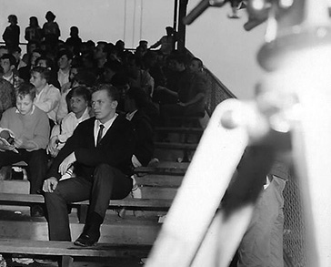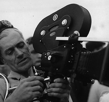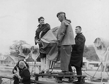 ![]() Up on the dolly, young Gregory Pike assists cameramen Ken MacAskill and Paul Holzwarth to get their gear under cover. |