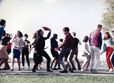 ![]() College scull crews and sailboats passing by on the Charles River provided a living backdrop to the concert sequence. |