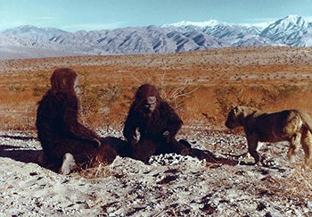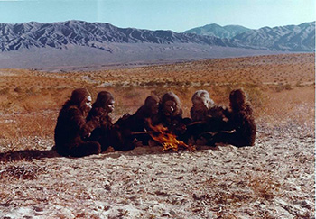 "You're just sitting around your campfire, one big, happy family. But do keep your hands close to your bodies. The glue that holds the hairy patches on your hands is flammable and we wouldn't want any mishaps . . ."