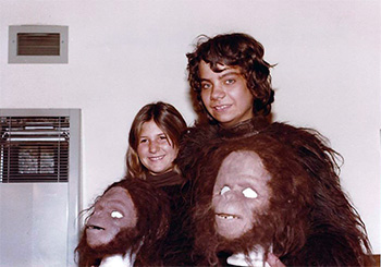 Top: Travis' youngest brother, Adam Pike, with Dina Backlinie, pose in their costumes for the first time. Below: While Adam and Shawn McEnroe look on, Steve Johnson applies makeup to prevent Dina's human face from showing under her mask.