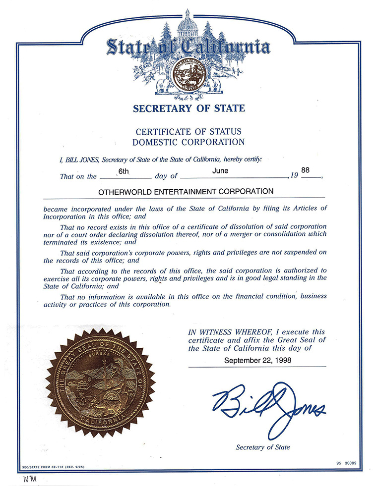 This official state document presented on the 10th anniversary of Otherworld Entertainment Corporation covers the ten years Travis was trying to fund his three- picture package of Morningstone, Grumpuss and Long-Grin. In the years since 1977, Changeling,, rewritten and retitled as MORNINGSTONE had proved out-of-reach for Cine-Media International, and Travis formed his independent production company to pursue funding for his several original properties with whatever partners, major distributors or independent investors he might attract. Ironically, especially with all Grumpuss's excellent reviews, awards and testimonials from librarians, teachers and fans, (including this certification for the California Seretart of State), Otherworld Entertainment Corporation filed for bancruptcy in 2001. |