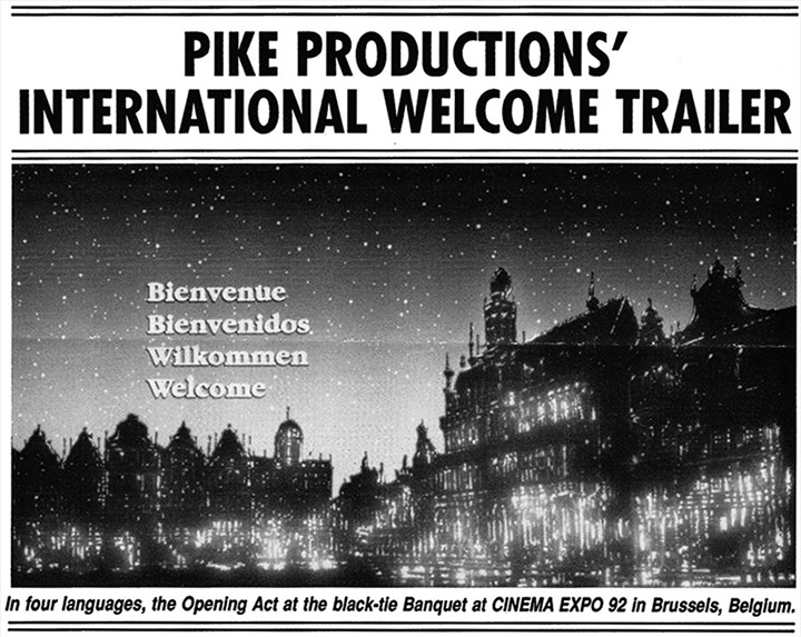 In 1991, Pike Productions relocated to Newport, Rhode Island, advertising itself as the Newport Company with the Hollywood Connection. In fact, Jim had two Hollywood connections. Travis, his son in Los Angeles, who assembled the Pike Productions showcase CDs of each year's generic theatrical trailer offerings for the National Association of Theater Owners annual convention, and Jim's youngest son, Adam, who produced more than 50% of the music and effects tracks for those trailers in his recording studio in Pasadena, California, including the music and effects for the Pike Productions curtain raiser at CINEMA EXPO 92, in Brussel's, Belgium. |