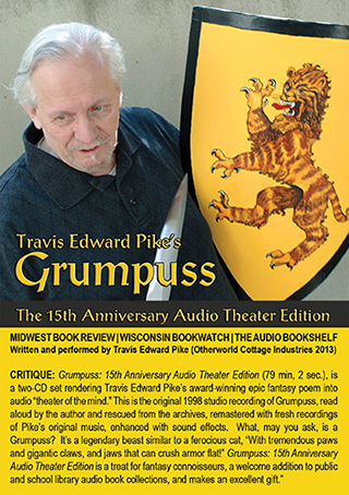 ![]() Travis Edward Pike: The Grumpuss Otherworld Cottage Industries. 2017 release. $22.95 Travis Edward Pikes Grumpuss is an enchanting tale of a monster-sized cat and the quest of one knight, Sir Ellery, to subdue it for the sake of salvaging his kingdom. The entire tale, carved into 4 distinct "acts (1 hour 38 minutes running time in the video version, 2 cassette tapes worth for the audio only version), is a rhyming epic-style romance in the spirit of the magical stories told by medieval bards before royal courts. And true to the spirit of that medieval inspiration, Pike performs the entire poem from memory! Thats right. Nary a cue card in sight. |