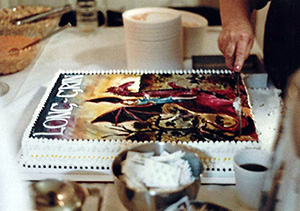 The cake made it to the dining room without mishap, where the guests lined up for servings. |