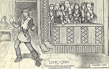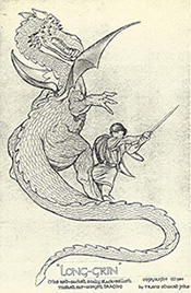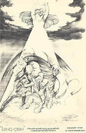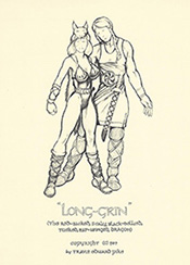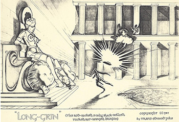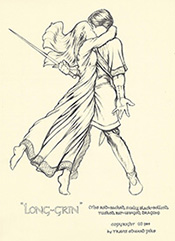 (1st column descending)--Nial misses his chance to slay Long-Grin. Sigismund and Hildegard become engaged. (2nd column descending)--Merlin has to deal with the sorcerer...and the dragon. Gwen embraces her hero, Nial. (third column descending)--Merlin warns the court of impending disaster. Akimera, kidnaps Princess Gwen. Nial runs afoul of the sorcerer. Looking at these sketches, the idea of Long-Grin as an illustrated novel, doesn't seem at all far-fetched. |