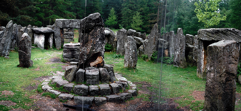 Sue Latham, then British Film Commissioner for Yorkshire, brought us to this inspiring Neo-Druid Temple that fit the description of the Morningstone Shrine Site. Certain we had found a perfect location for the film, we couldnt wait to show the photos to Peter Anderson, the designated Director of Photography for Morningstone. He appreciated the photos, but ruled out the practical location on the grounds that the shooting schedule called for weeks of shooting at that location, mostly at night, and much of it at the magic hours (pre-dawn and dusk). Without taking into consideration the time of day, Peter said that by the second day of shooting, the production crew and equipment would have reduced the site to a trampled down disaster site (dry if we were lucky, muddy if we were not). The photos would be a useful guide to the set designer, but a huge greens set would have to be built on a sound stage. Not only would we then be safely out of the weather, but we could control the time of day, pre-lighting for night (which would be shot during regular daylight hours, avoiding the inevitable delays and additional costs of night shooting by rigging our lights for all day sunrises, all day days and all night nights, all shot during regular daylight hours). In spite of the cost of renting a sound stage for the build, shoot, and strike periods, it would result in significant savings to the production, and the ability to stay on schedule, no matter what the weather. Peter was correct, of course, and his advice invaluable. It was for just such first-hand knowledge and experience that he had been chosen to be the Director of Photography. We weren't even funded yet, and he'd already saved us a ton of money and a world of misery. The promised funding for this production failed to materialize, but in 1997, Peter and Travis did finally work together on Pike's World Premier Benefit Performance of Grumpuss at Blenehim Castle, where Peter's wisdom and expertise was largely responsible for the success of that production. Travis was wearing too many hats, and when anticipated funding was not forthcoming, Peter brought all his production skills to bear, freeing Travis to focus mainly on performance issues. The shrine site first appears on the movie screen in the Morningstone Pub and features Laura singing "Morningstone" at sunrise. On the pony ride that takes them past the shrine site, Morgen thoughts are reflected in his voice-over song, "The Likes of You." And later that night, when all the villagers go dashing into the dark in pursuit of intimate pleasures, this is where Morgen's voice-over song "Peeping Tom" begins. The next day, after his sojourn in The Tomb of Every Hope, "The Fool" concludes with Morgen's arrival at the top of the hill overlooking the shrine site, and at that time, the farmers' wives and village ladies sing "The Mystery" as Laura approaches, riding side-saddle on her "unicorn" but dragging one foot along the ground (thus neither riding nor on foot), neither clothed nor naked (her long golden hair held modestly in place by a fishnet), carrying a hare in her lap (a gift she releases when she arrives, thus fulfilling the convention than she arrive neither with, nor without a gift), an excellent example of a Changeling's Return, pre-Christian mystery revealed. |