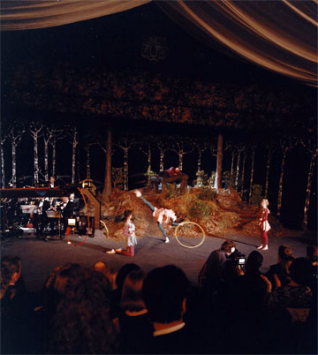 We made it to intermission on schedule. Several guests gathered to cheer me on, fascinated by the scope and complexity of the production, a few non-relatives wondering where I found those wonderful young ladies. Anna pronounced perfect in her role, what a wonderful job I was doing, and how they couldn't wait to hear the rest of the story. Some even said how privileged they were to have been invited. As my well-wishers continued out to the Great Hall for refreshments, Peter Anderson came in from the production van to see how I was holding up, told me I was doing great, and it all looked good so far. All this, while I dealt with a myriad of technical questions from the crew. And then, before I ever left the stage, the audience began returning to their seats for Act Three. |