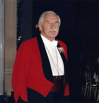 Mr. Raymond P. Huggins, MBE, MSM, CdeR, was our Master of Ceremonies at the World Premiere Benefit Performance and Banquet. Mr. Huggins, well known in British military circles, joined the Grenadier Guards in 1945 at the age of 17. He saw duty in Germany, the Middle East, North and West Africa and South America. In 1965, he was promoted RSM (Regimental Sergeant Major) and in 1970, appointed Academy Sgt. Major at Sandhurst (Senior RSM post in the British Army), where he served until his retirement from active duty in 1980. During his career, in recognition of his service, he was appointed a MBE in 1973 (Member of the Order of the British Empire), received the MSM in 1974 (Meritorious Service Medal), was awarded the CdeR by the French Army in 1976 (Cross of Recognition). He represented his regiment in Rugby (1946 to 1965); swimming and water polo, sword fencing and was Regimental Light Heavyweight Boxing Champion in 1950, all of which put me in mind of Sir Ellery, the hero in Grumpuss. |