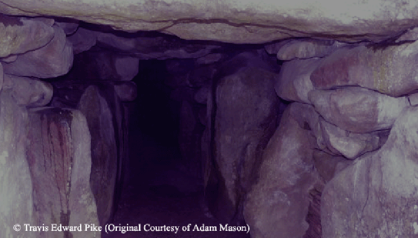 This photo of the entrance to the West Kennet Long Barrow was taken in 2009 by Adam Mason. It is much higher and wider than the one Morgen crawls into following a mastiff down into the Tomb of Every Hope. The stone slab corridor will continue to grow smaller as Morgen goes on, until he has to crawl along on his belly in the near total darkness, but he hears the dog in the distance, barking inside what sounds like a large chamber, so he keeps going. Suddenly, the floor of the stone slab corridor seems to fall away. In fact, Morgen has just emerged from the end of the passageway, and with the mastiff slobbering all over his face, he pushes his way out of narrow passageway and falls into the Tomb of Every Hope, a large vaulted chamber with a brook running through it, dimly lit by an oculus-like opening at the very top. Among the Special Effects challenges Morgen will face within the vault are the slabs that form the floor and, at a Furys' command, slide apart, emptying the brook into a chasm, that instantly sends steam billowing into the vault from the exposed magma bubbling below. Morgen manages to keep himself and the mastiff from falling into the hole, until the Fates reverse the Fury's action, causing a second Fury to summon cold that freezes the brook, Morgen and the mastiff, until similarly thawed out by the Fates. The third and final Fury's horror is the threat of an AIDS-like plague specific to mankind (unknown or certainly unidentified when the story was first written), postponed by the intervention of the Muses. Add to the moveable floor, pyrotechnics in the torches that further illuminate the interior of the vault and reveal the Furies, Fates, Muses, and Laura, chained to the rock wall of the vault -- and the Cauldron of Inspiration, from which Morgen accepts a sip, then falls to the floor like one dead. When he regains consciousness,the pyrotechnics illuminating the interior of the cavern now reveal the exotically furnished Fool's Chamber, with the brook flowing along a depression in the middle of the slab floor, that Morgen follows to the cave exit on the other side of the hollow hill, as he begins singing "The Fool." He emerges above a pond at the foot of a cascade, that is the source of the exterior Stream of Consciousness. Elsewhere within the cavernous Tomb of Every Hope (possibly on another wet set), there will be an underground grotto wherein Laura, a goddess, bathes, preparing for her nuptials, and the brook again, this time flowing into and through the grotto. The dry area of this "underground" set must be large enough to hold the pony (now unicorn), and ponycart, and allow three teenage girls to decorate the pony's bridel with flowers while they sing "Dog, Roebuck and Lapwing." |