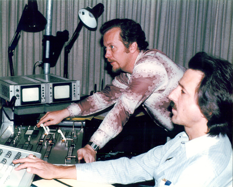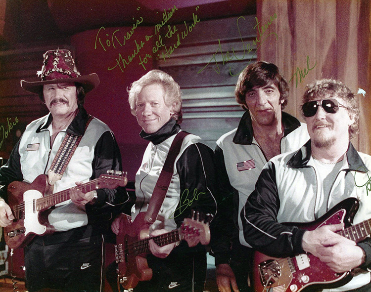 David Carr, who frequently worked with the Ventures, had just finished recording Travis Pike's songs from his Long-Grin Saga, and asked Travis to co-produce and direct a long-form Ventures music video celebrating the 25th anniversary of America's Space Program, for Award Records and Tapes. Together they studied available NASA footage, came up with a budget, and filmed the one day shoot at Conway Recording Studios in Hollywood, to be augmented by the NASA footage. David sat in at the editing session at the Horizontal Video Editing facility in Burbank, California, where Travis artfully cut together the fan-favorite shot of Mel, set up by cinematographer Harry Mathias when he shot Mel playing a fill from beneath his floor tom, that Travis intercut with a shot of a NASA booster rocket separation. |